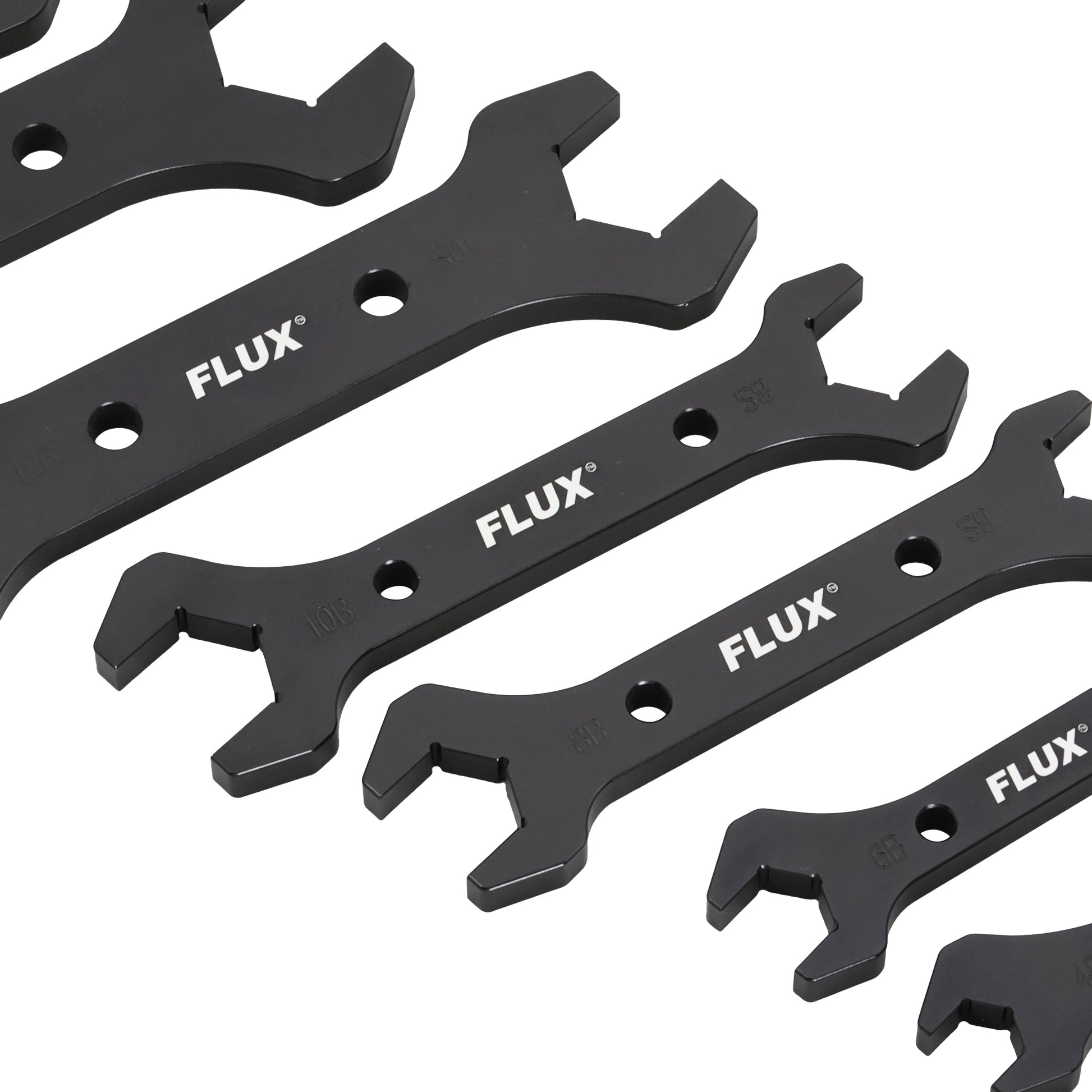 Manufactured from high-grade aluminium, every spanner is hard anodized in black for durability and clearly stamped with its size for easy identification. The double-ended design is tailored for use with B-nuts on AN fittings.